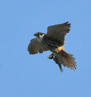 Waarna de Boomvalk weer vliegensvlug omkeert en opnieuw gaat jagen.